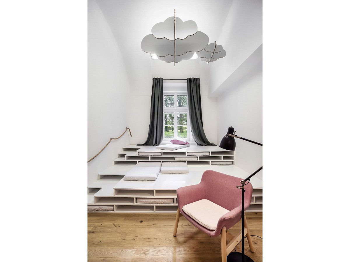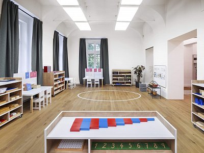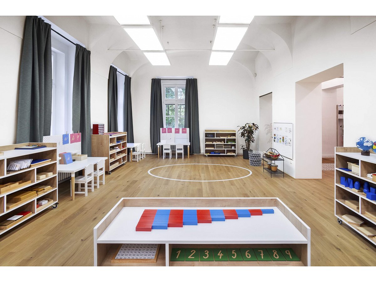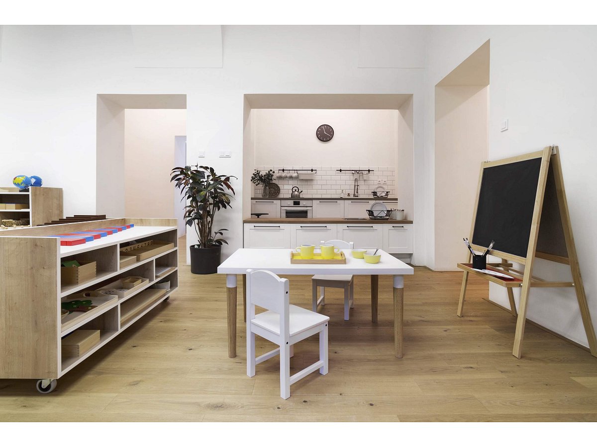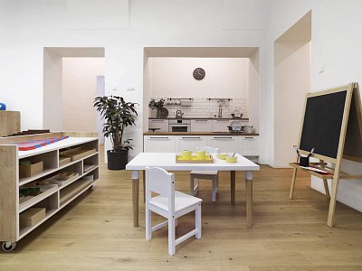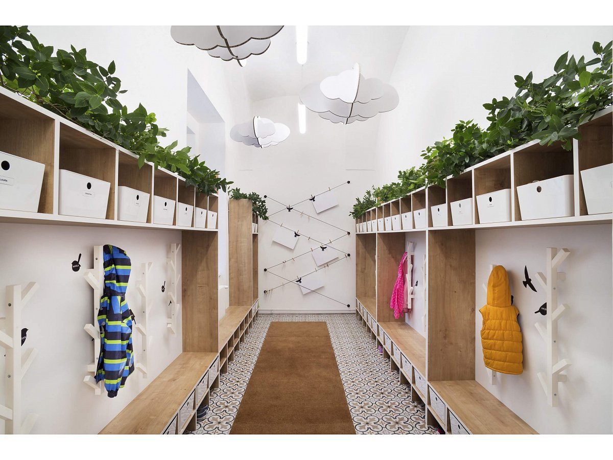 Vybavení místnosti na hraní, kde je myšleno především na bezpečnost a pohodlí dětí, realizace pódia na spaní s jednoduchým ukládáním matrací. U realizace kuchyňky bylo myšleno i na ty nejmenší – kuchyňka je vyrobena v nižší výšce, aby se i oni mohli od raného věku realizovat právě u těchto činností. Samozřejmostí je realizace a vybavení toalet, kde je opět vše přizpůsobeno pro malé předškoláky. A samozřejmě spousta detailů, působících pozitivně i na ty nejmenší.