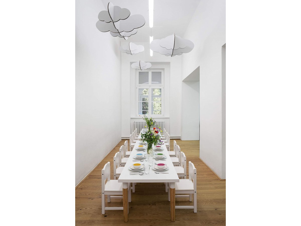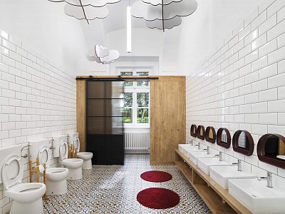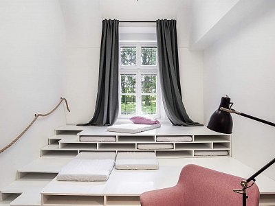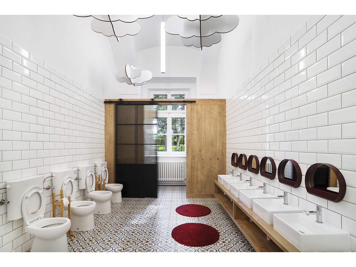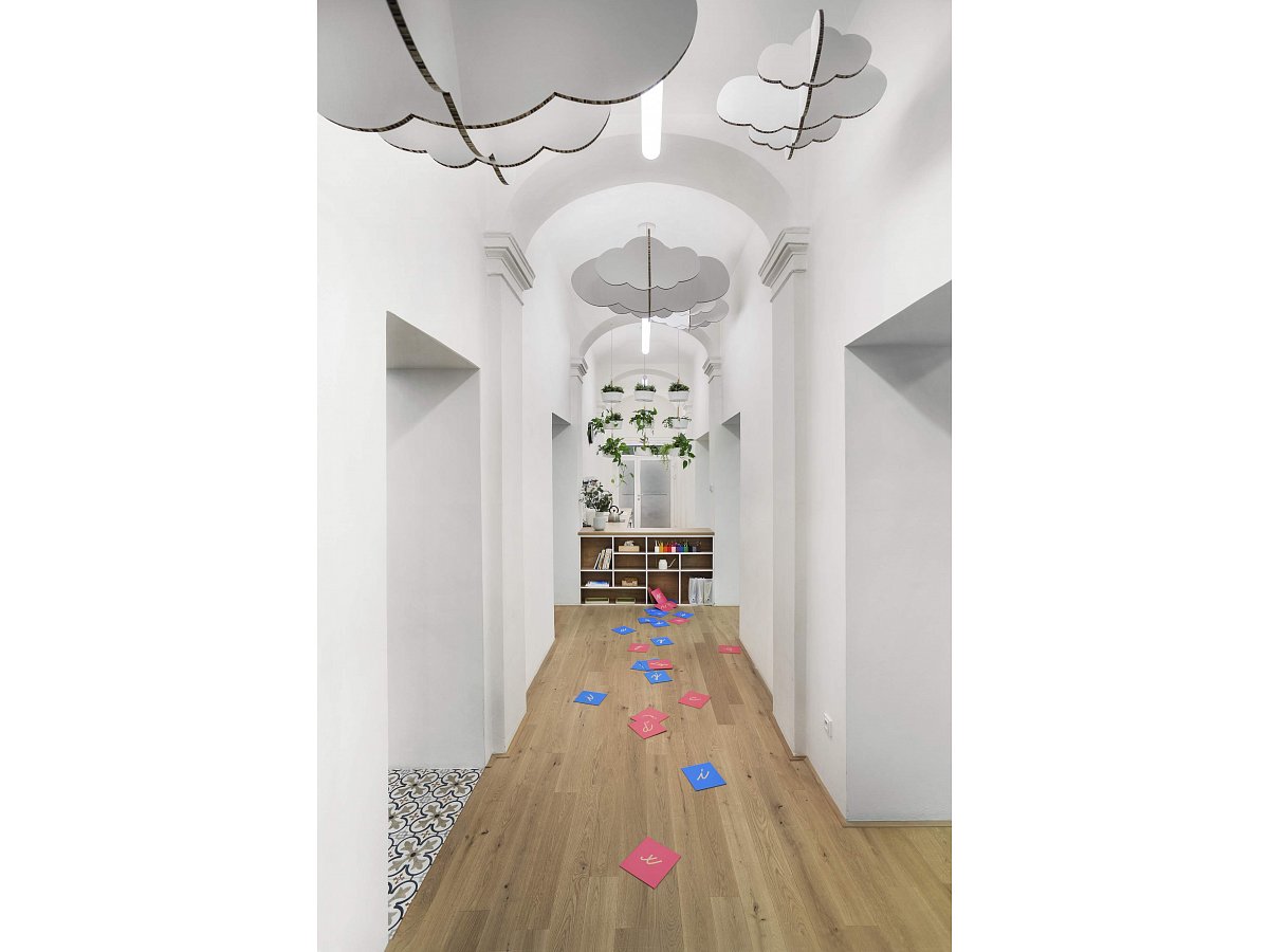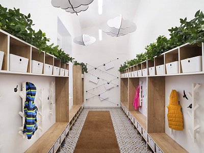 Vybavení místnosti na hraní, kde je myšleno především na bezpečnost a pohodlí dětí, realizace pódia na spaní s jednoduchým ukládáním matrací. U realizace kuchyňky bylo myšleno i na ty nejmenší – kuchyňka je vyrobena v nižší výšce, aby se i oni mohli od raného věku realizovat právě u těchto činností. Samozřejmostí je realizace a vybavení toalet, kde je opět vše přizpůsobeno pro malé předškoláky. A samozřejmě spousta detailů, působících pozitivně i na ty nejmenší.