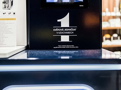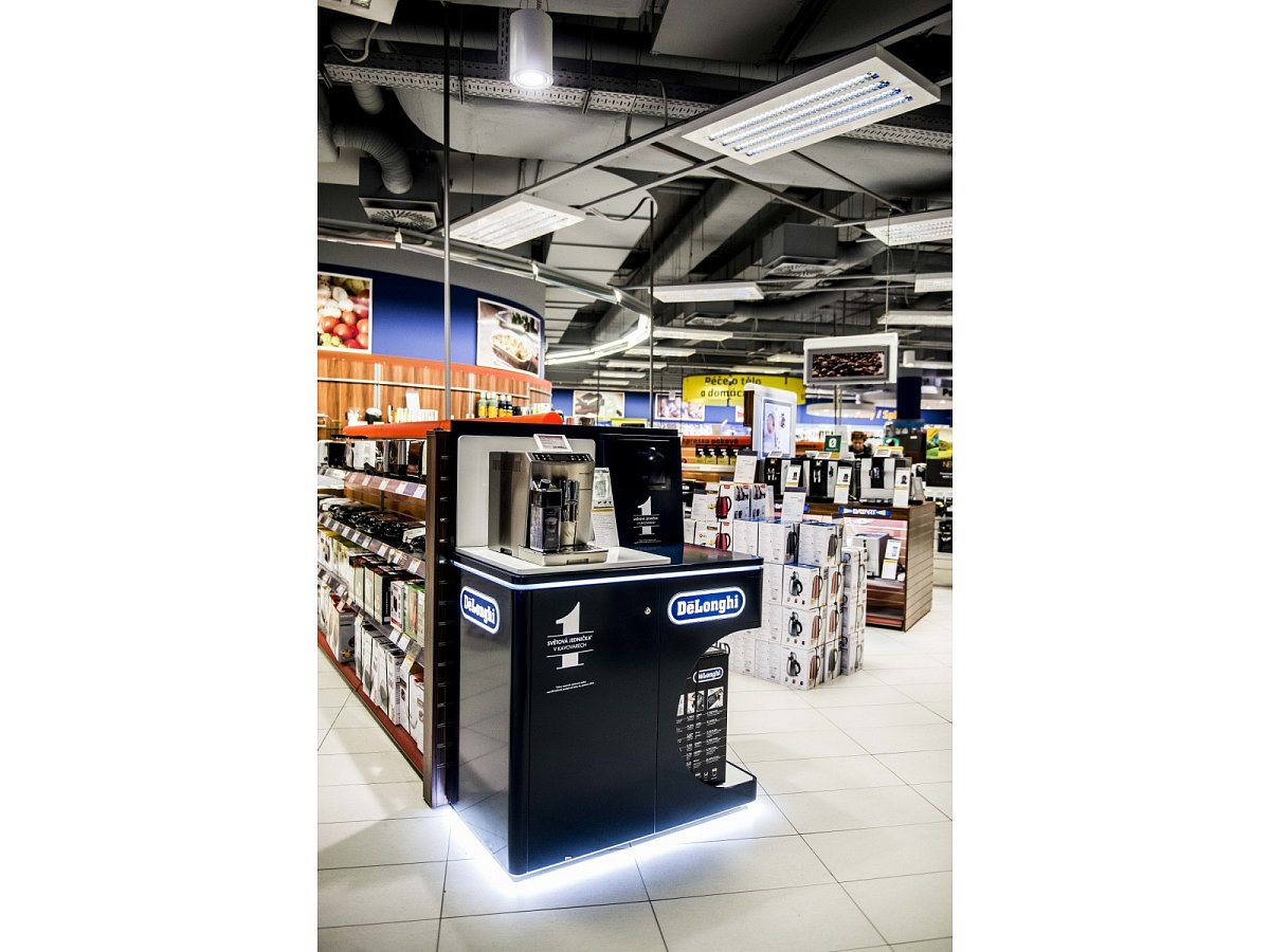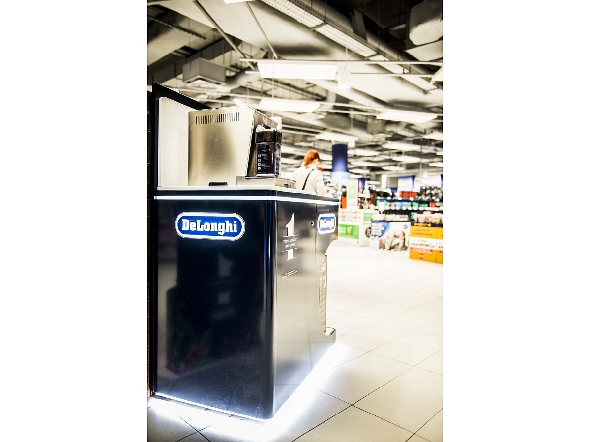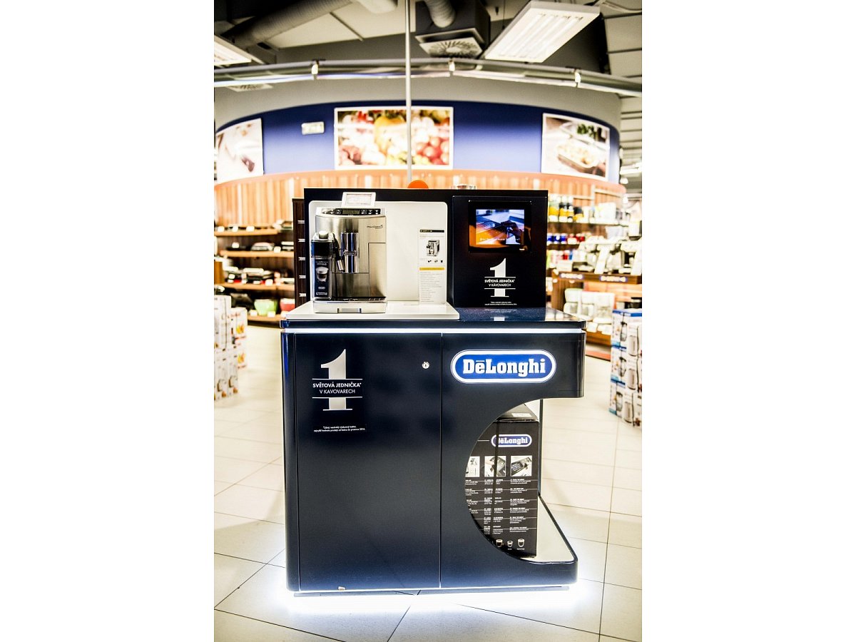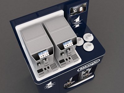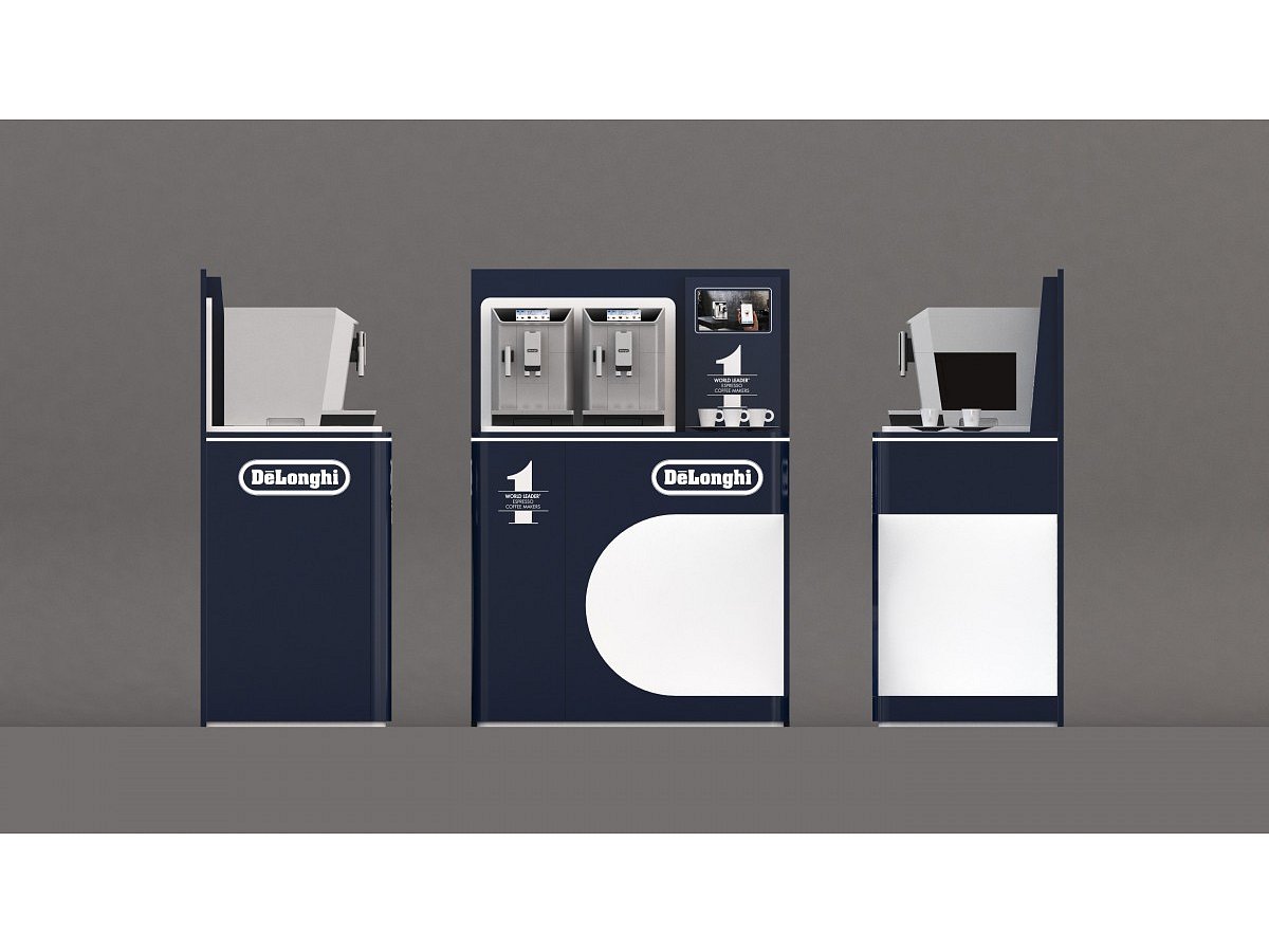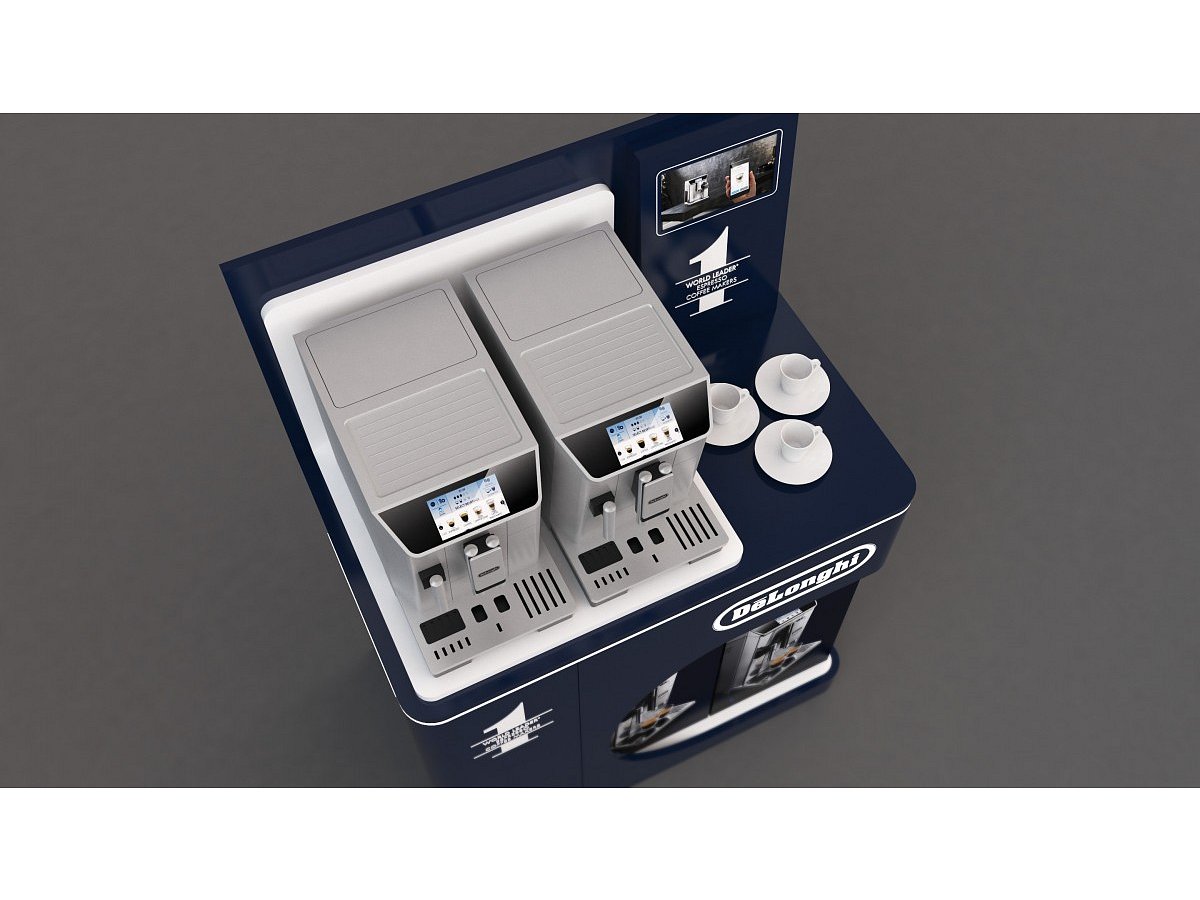 Navržen pro prezentaci dvou kávovarů s prostorem pro umístění samotného produktu k prodeji. Vyroben z lakovaného MDF, bílého lamina a vše doplněno LED světlem.