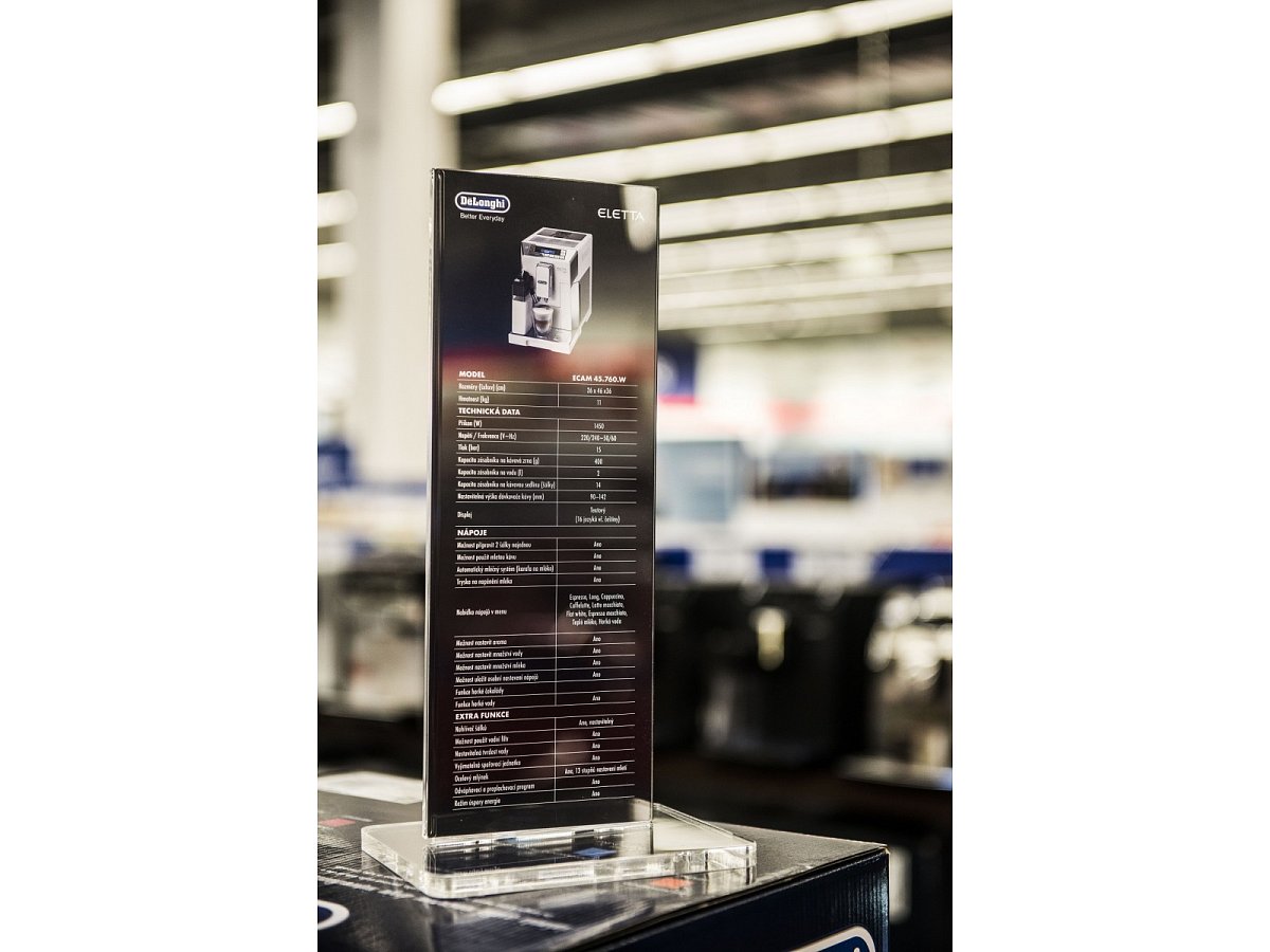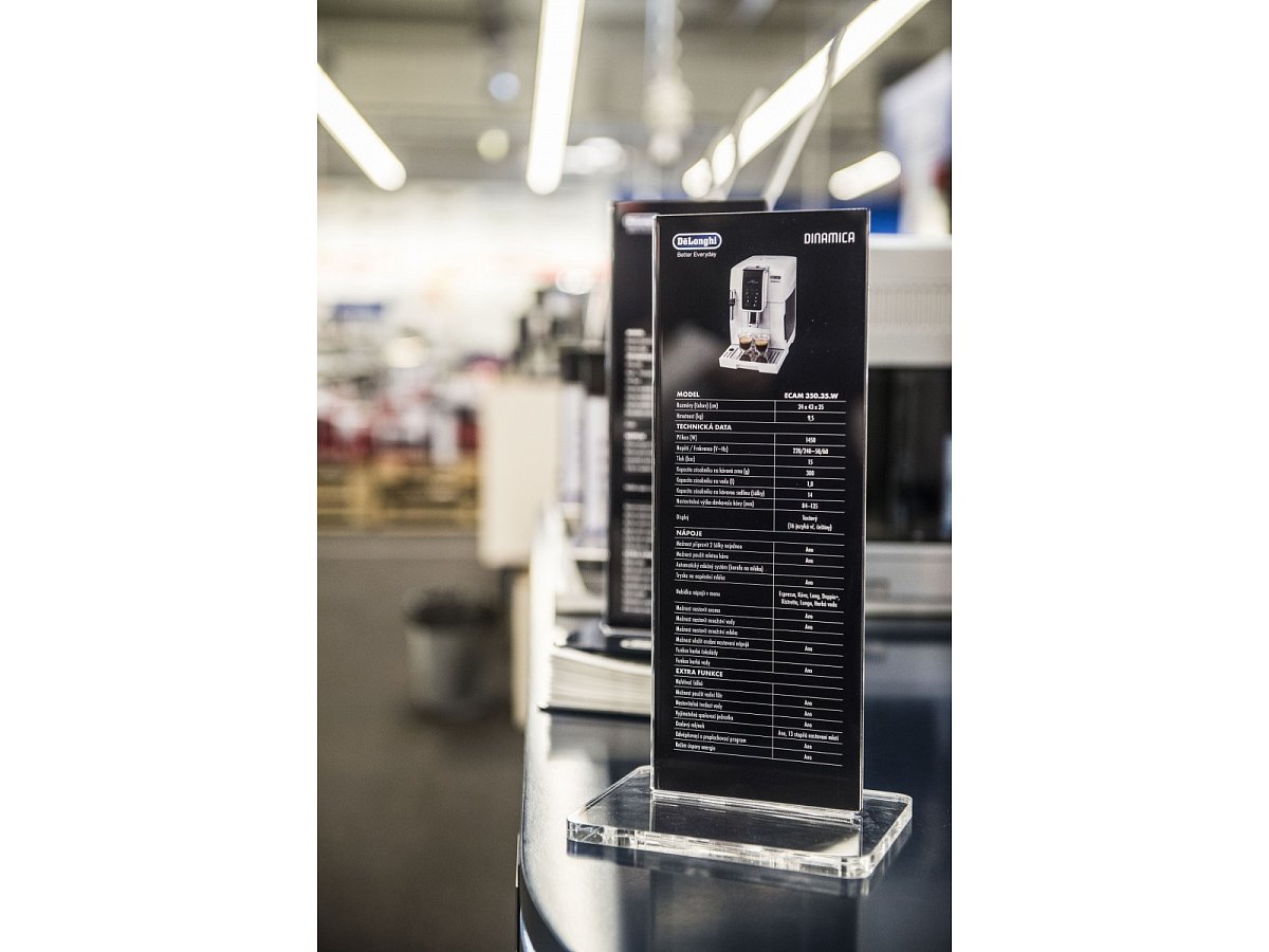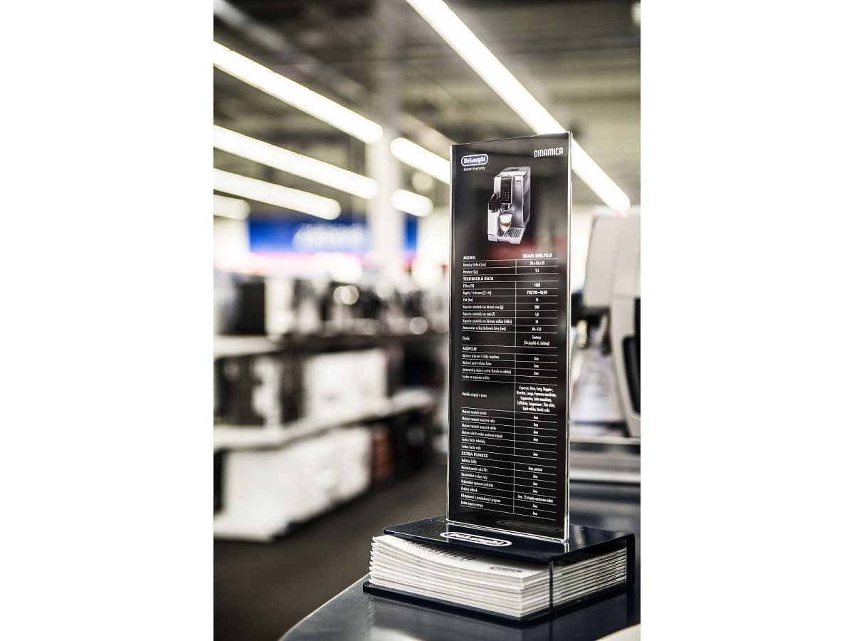 Stojánky na popis výrobků jsou vyrobeny z čirého plastu a lze u nich měnit obsah dle potřeb klienta. Zhotovení je ve dvou verzích – bez podesty a s podestou pro možnost vložení informačních brožur.