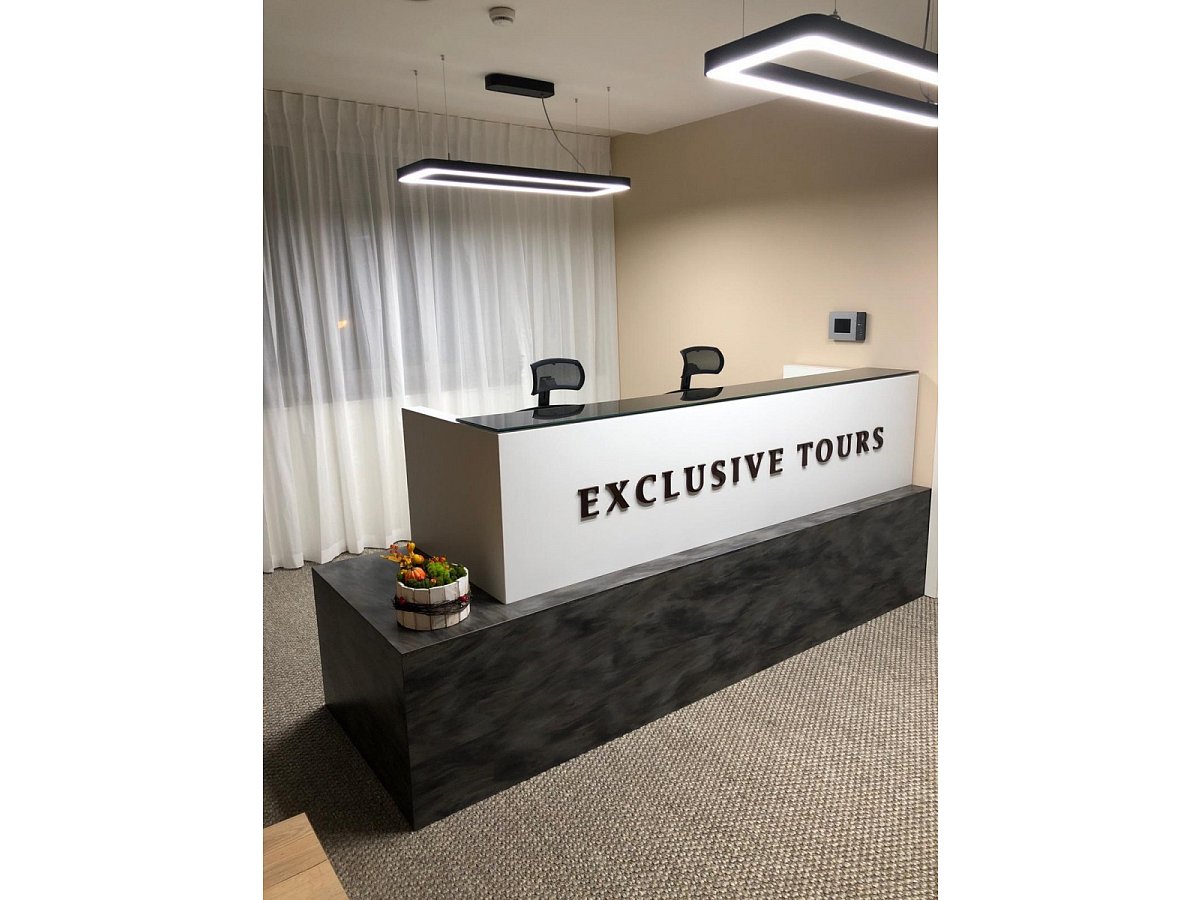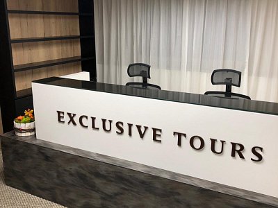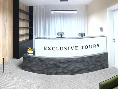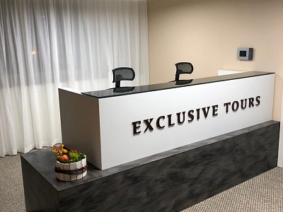 Zadání od klienta bylo vyrobit recepci EXCLUSIVE TOURS pro svoje zaměstnance. Recepce je právě to místo, které první vidíte, pokud jakoukoliv instituci navštívíte. A to my dobře víme a proto jsme pro cestovní kancelář vyrobili recepci z prémiového Corianu a z černého kaleného skla. Nesmí chybět ani 3D brand.