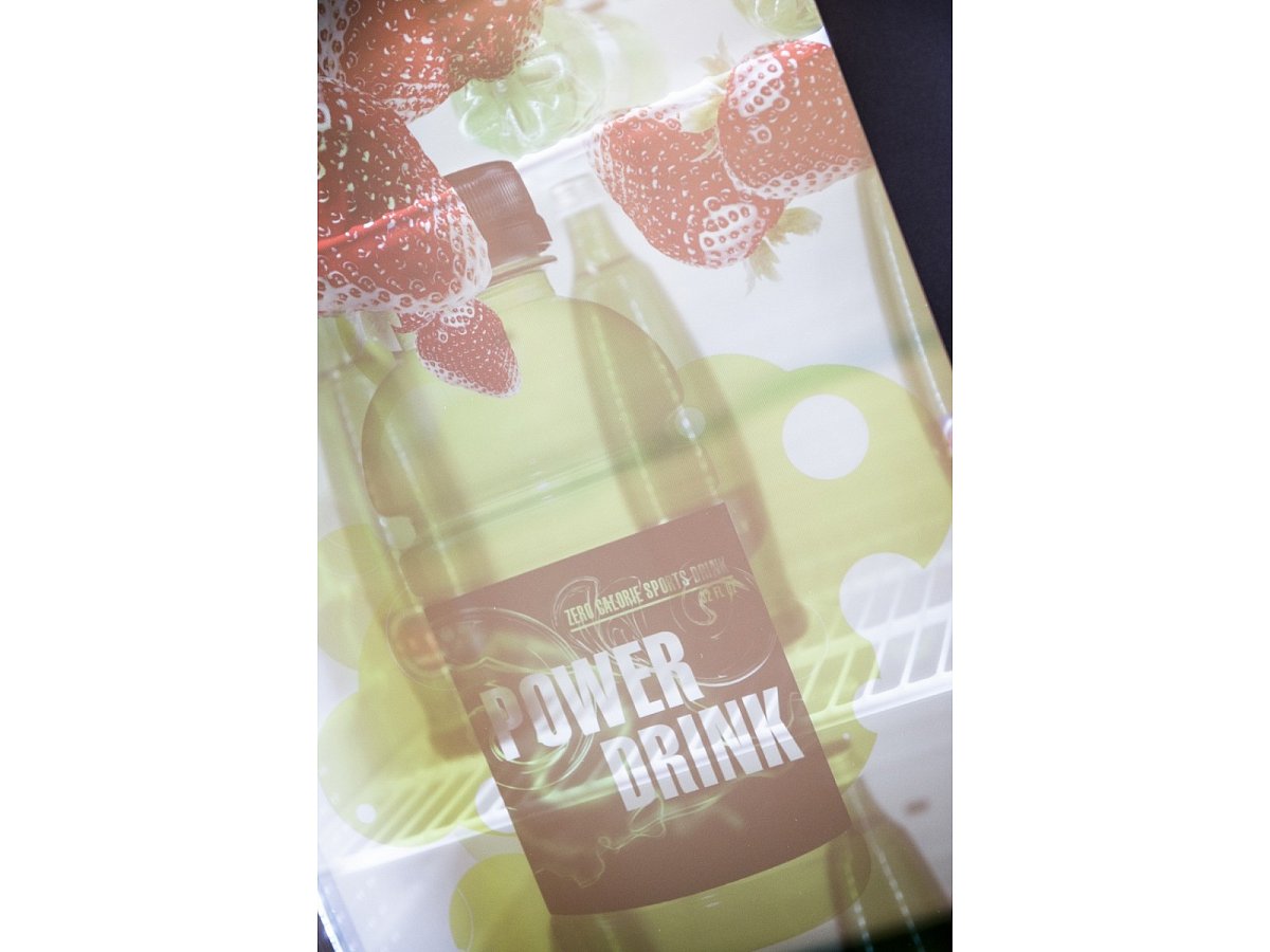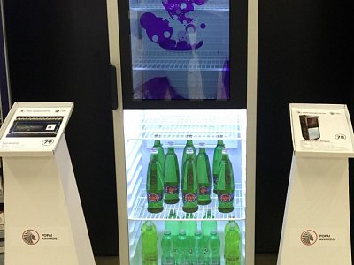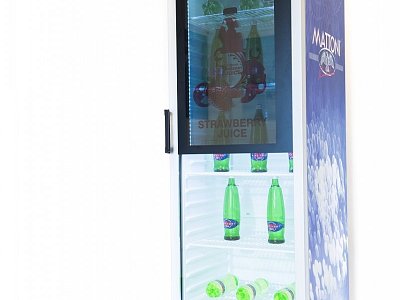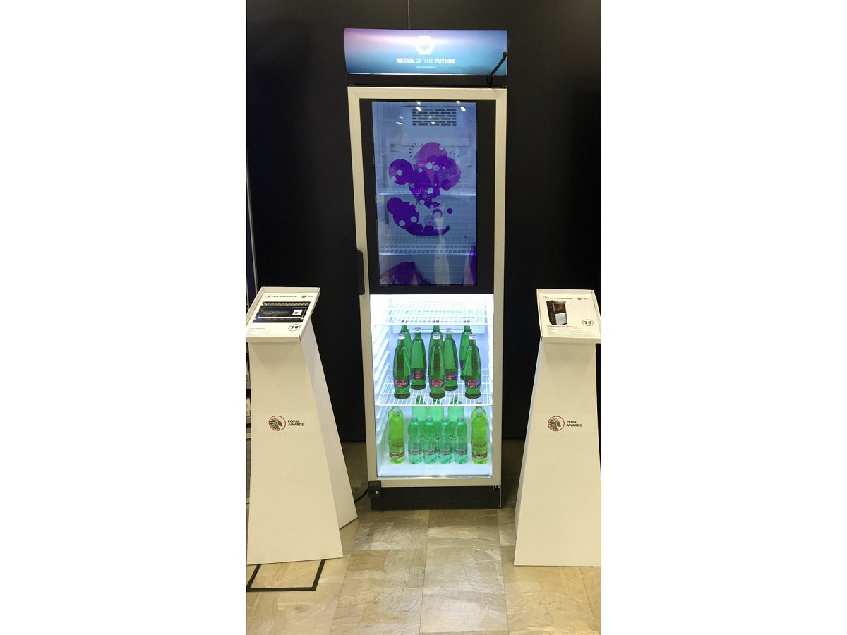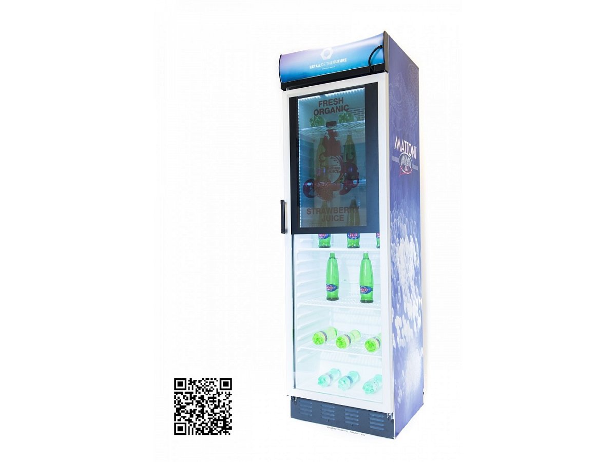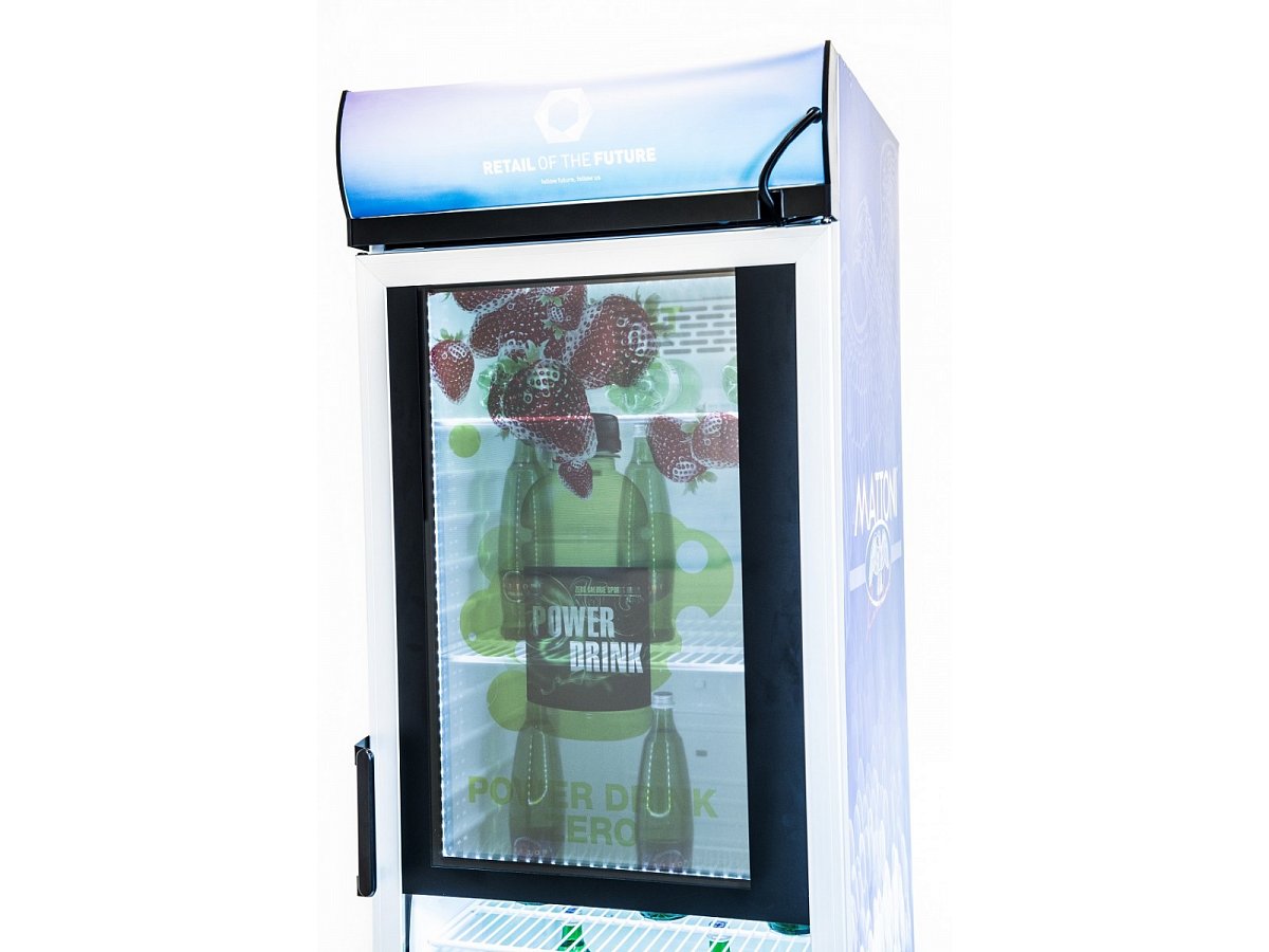 Standardní lednice s průhledným screen zabudovaným ve skleněných dveřích. Ovládání přes mini počítač s možností vzdálené správy, takže změnu vizuálů na screenu zvládne i samotný klient.