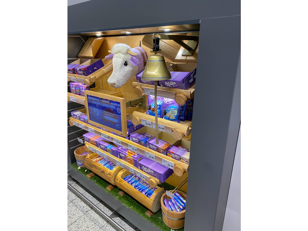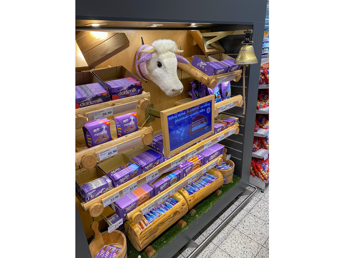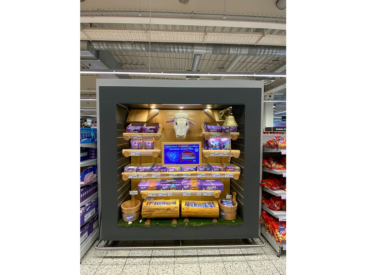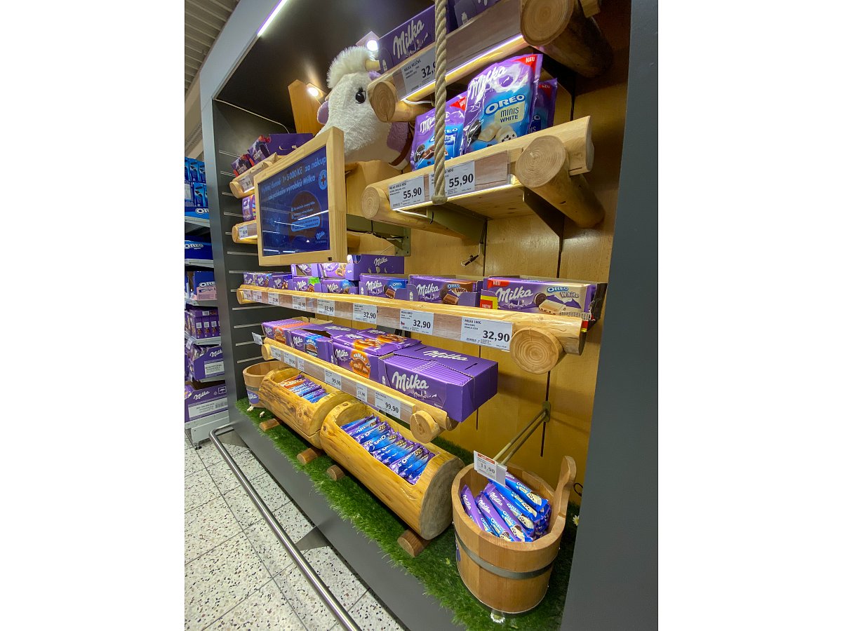 Designový POP, který jsme vytvořili podle shelf in shelf konceptu, určený k vystavení produktů Milka v prodejně Globus.