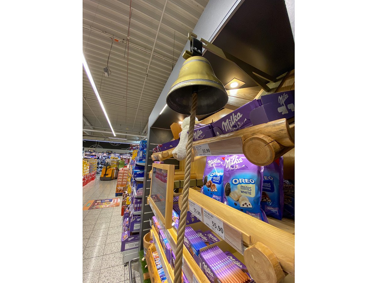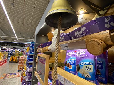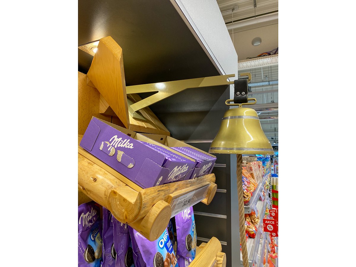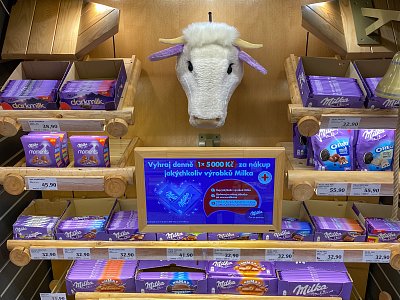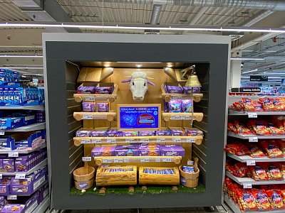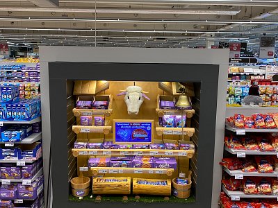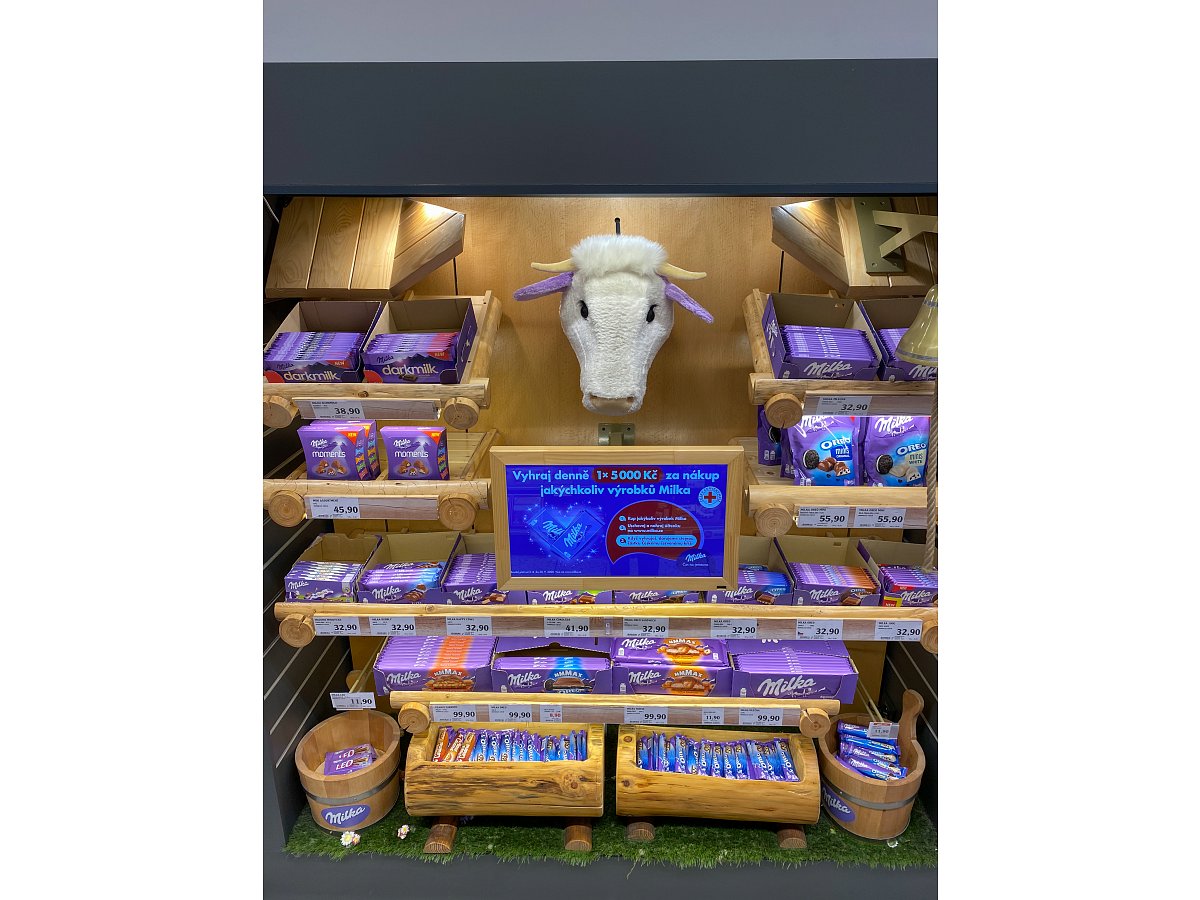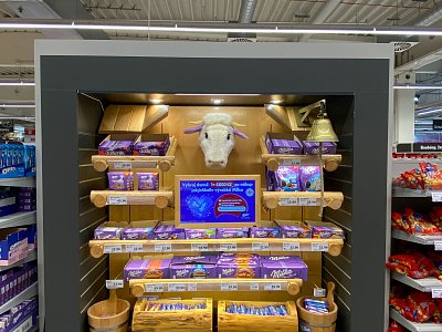 Designový POP, který jsme vytvořili podle shelf in shelf konceptu, určený k vystavení produktů Milka v prodejně Globus.