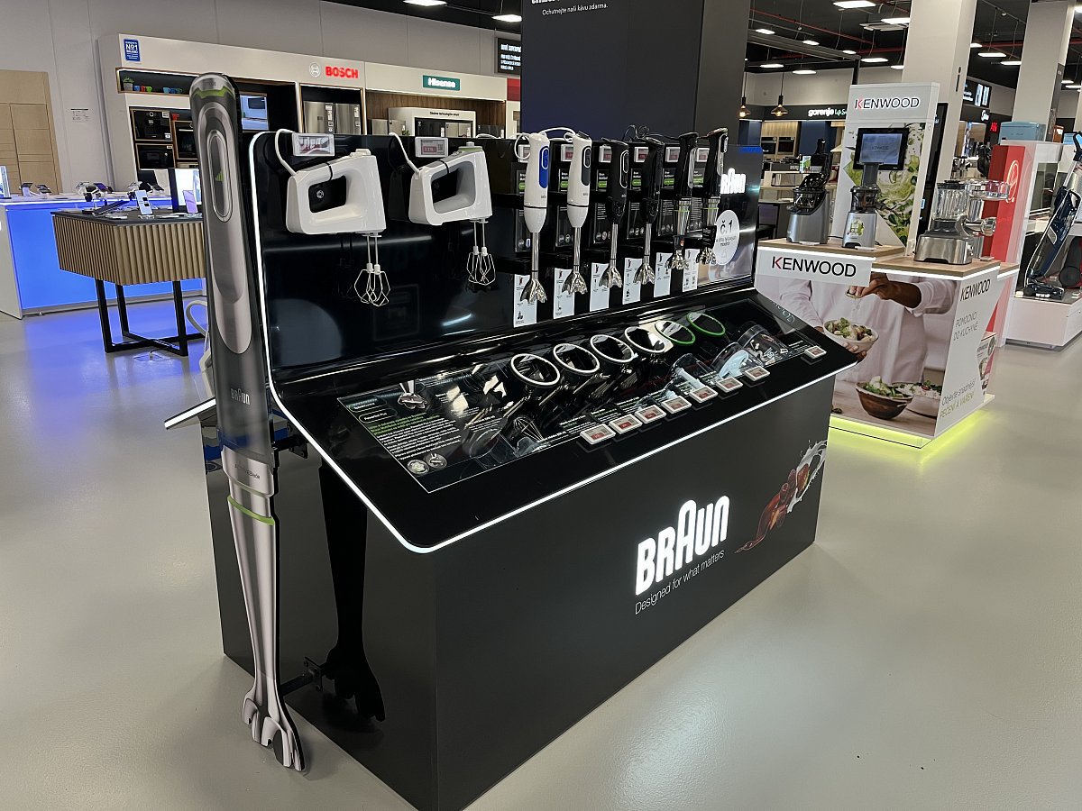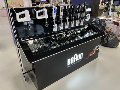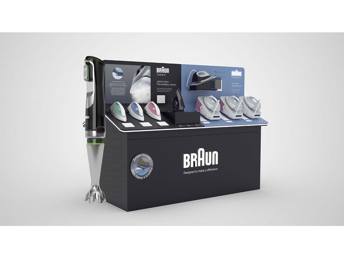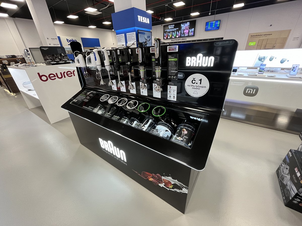 Klient dostal k dispozici prostor pro své produkty na nové prodejně Alza Chrášťany. Vytvořili jsme pro něj stůl z umělého kamene, kde z jedné strany prezentujeme kuchyňské spotřebiče s příslušenstvím a z druhé strany parní generátory s žehličkami. Stůl má z čelní strany 2D maketu ručního mixéru.
