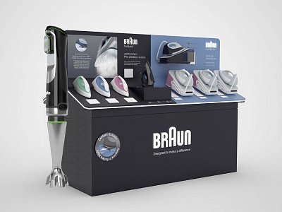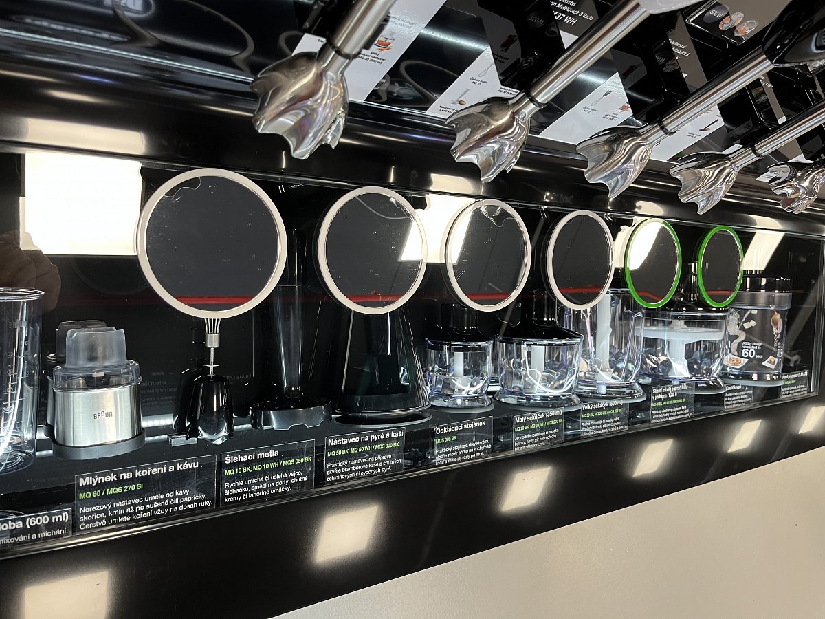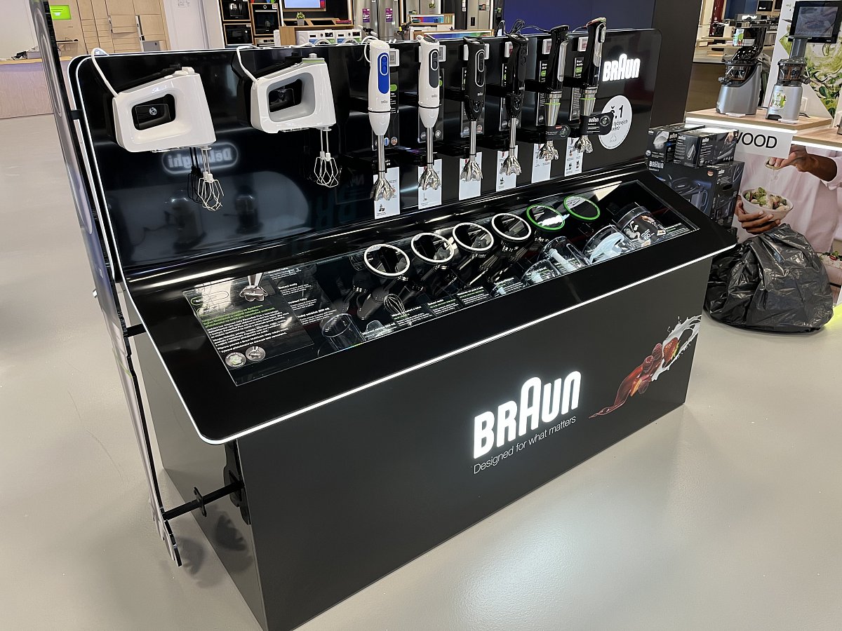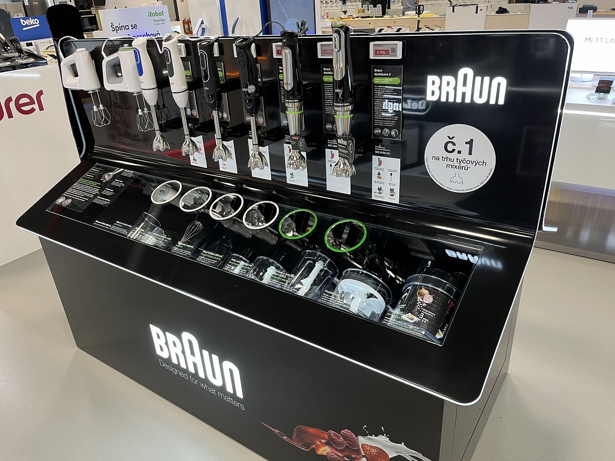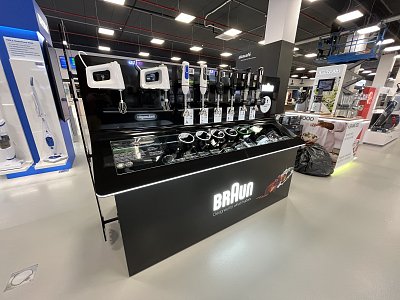 Klient dostal k dispozici prostor pro své produkty na nové prodejně Alza Chrášťany. Vytvořili jsme pro něj stůl z umělého kamene, kde z jedné strany prezentujeme kuchyňské spotřebiče s příslušenstvím a z druhé strany parní generátory s žehličkami. Stůl má z čelní strany 2D maketu ručního mixéru.
