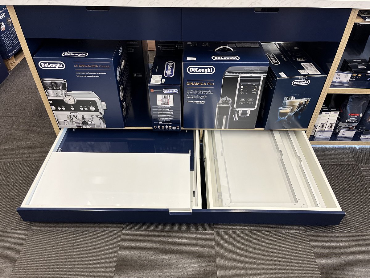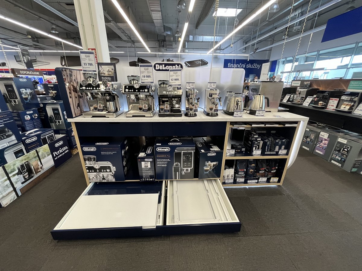 Stůl je vyrobený podle návrhu italských architektů, ale s úpravami šitými na míru českému trhu. K originálním prvkům našeho provedení patří především šuplík se skládacím promostolkem, který mohou hostesky a promotéři jednoduše složit bez asistence a pomocné techniky.