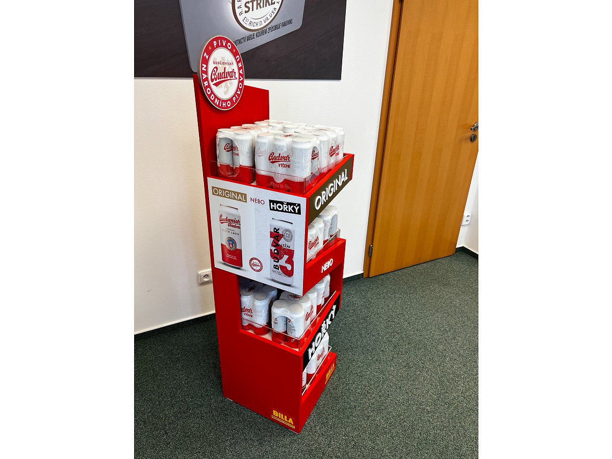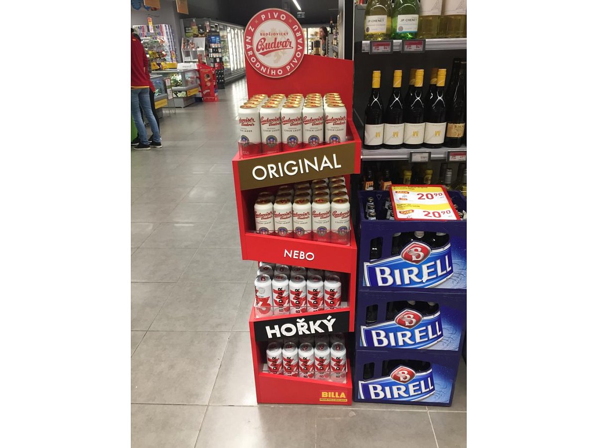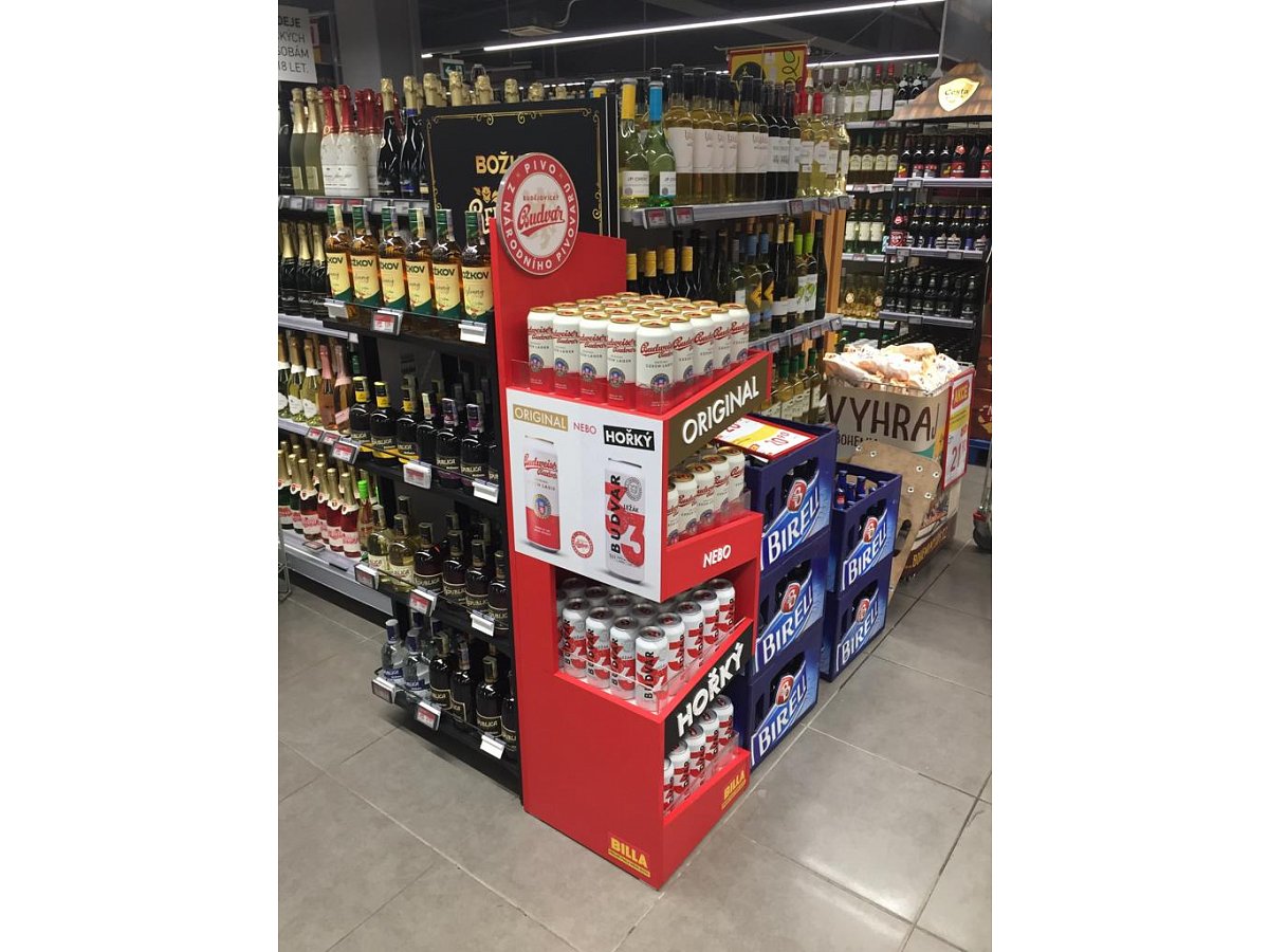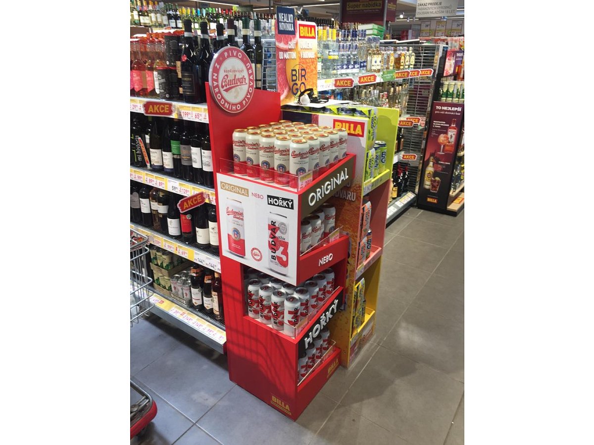 Pro značku Budějovický Budvar jsme vytvořili prodejní stojan, který byl umístěný v nápojové sekci v prodejnách Billa.