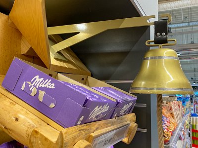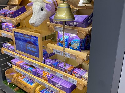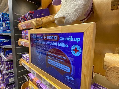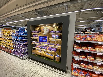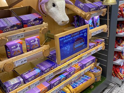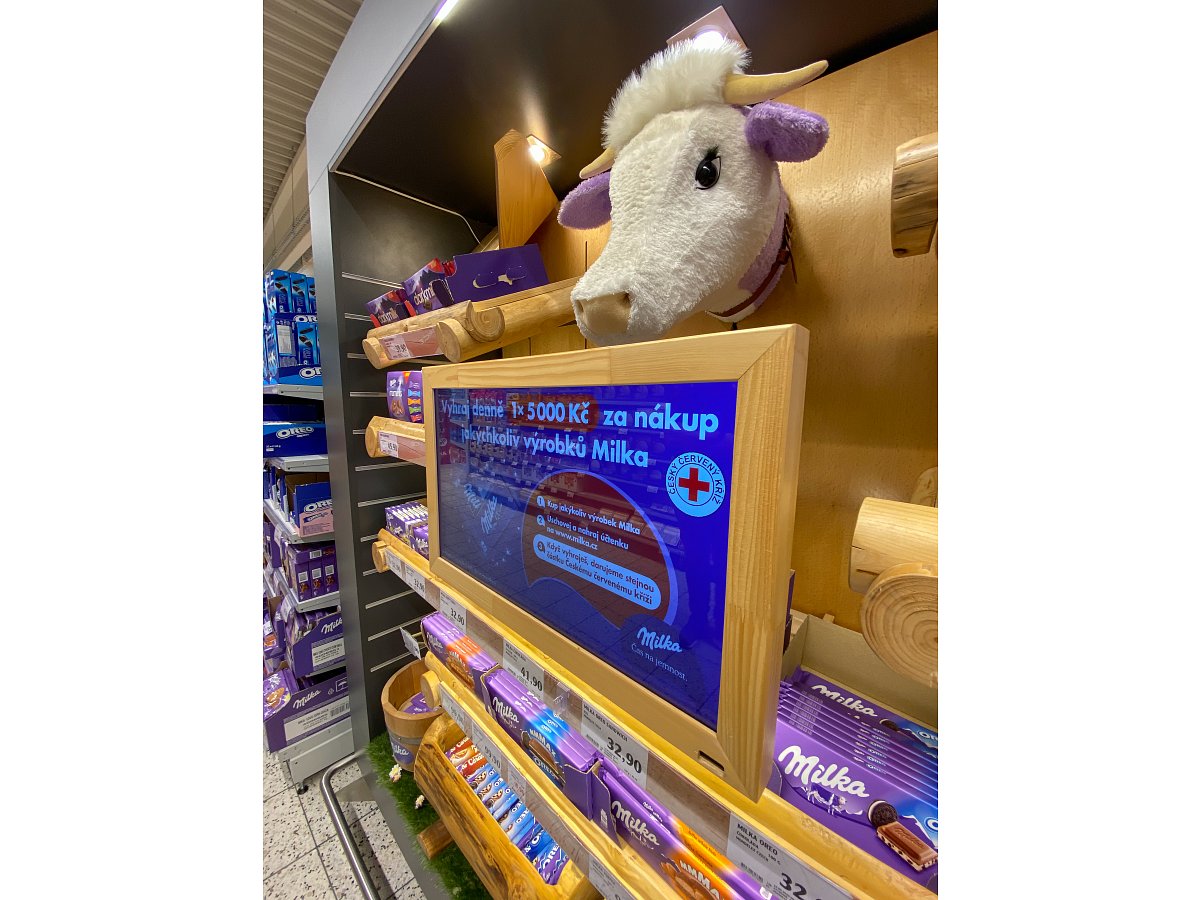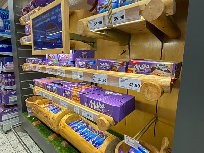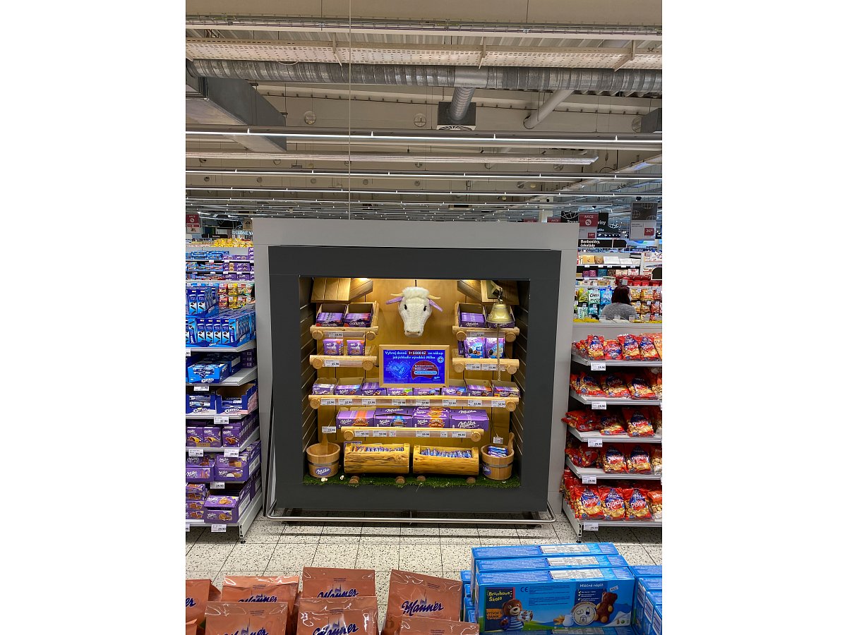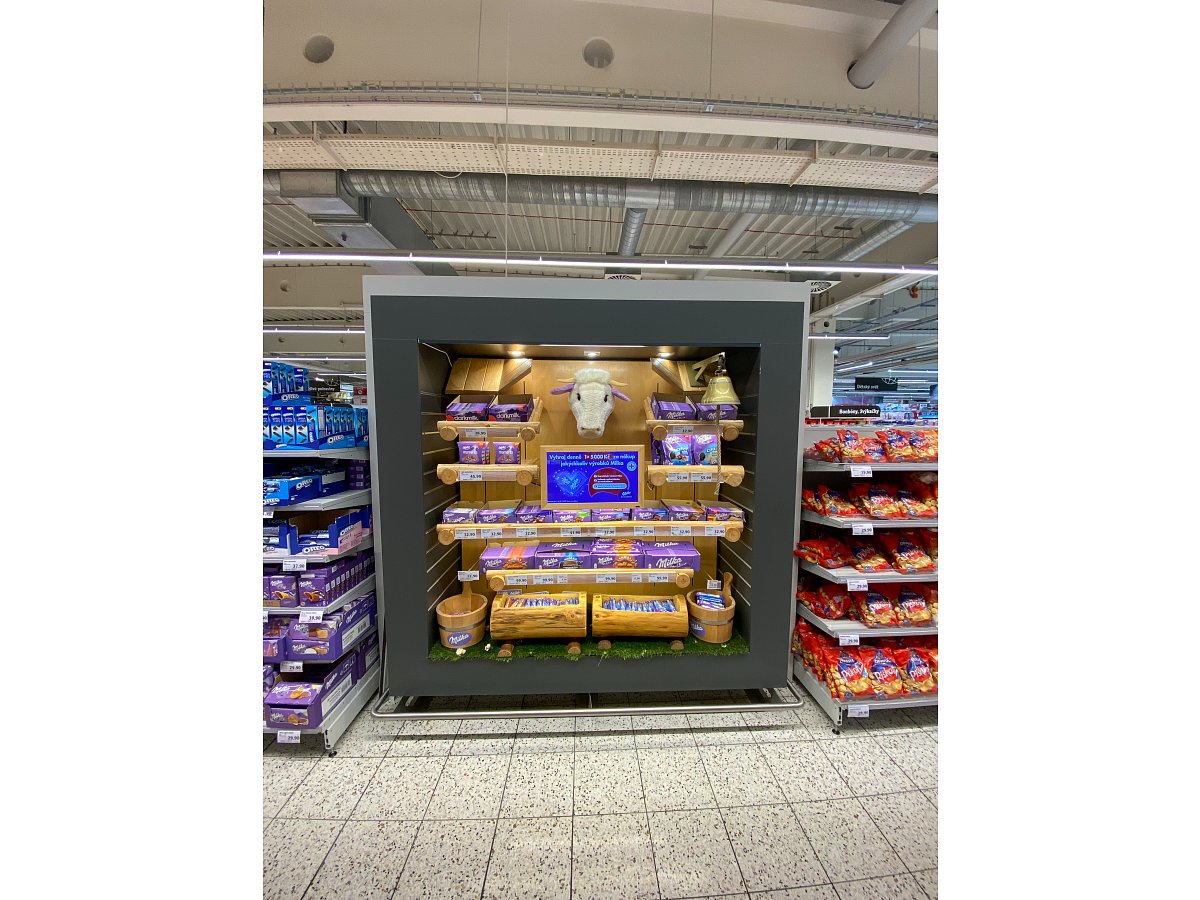 Designový POP, který jsme vytvořili podle shelf in shelf konceptu, určený k vystavení produktů Milka v prodejně Globus.