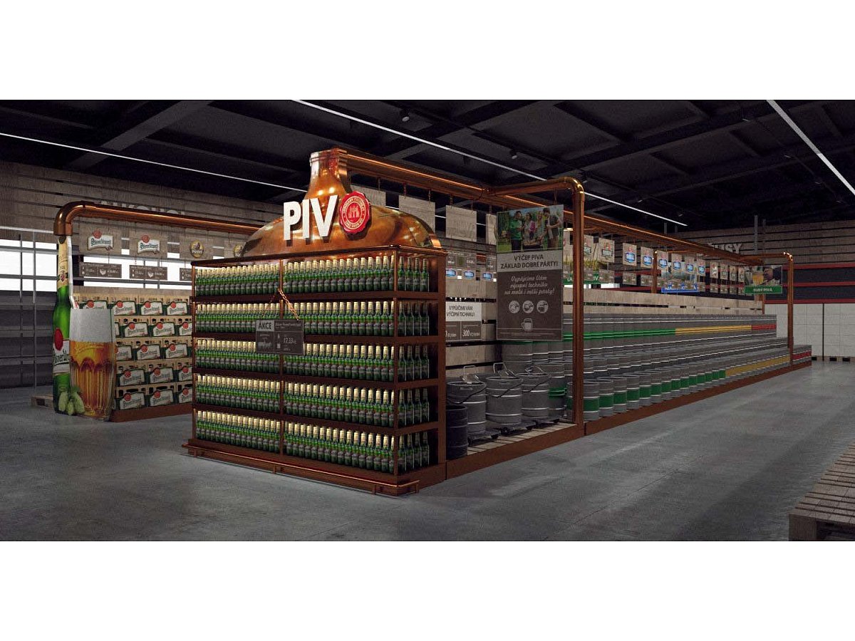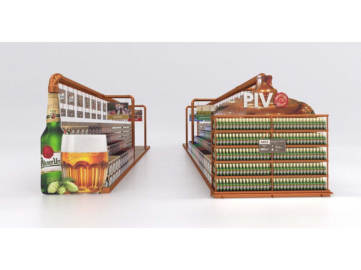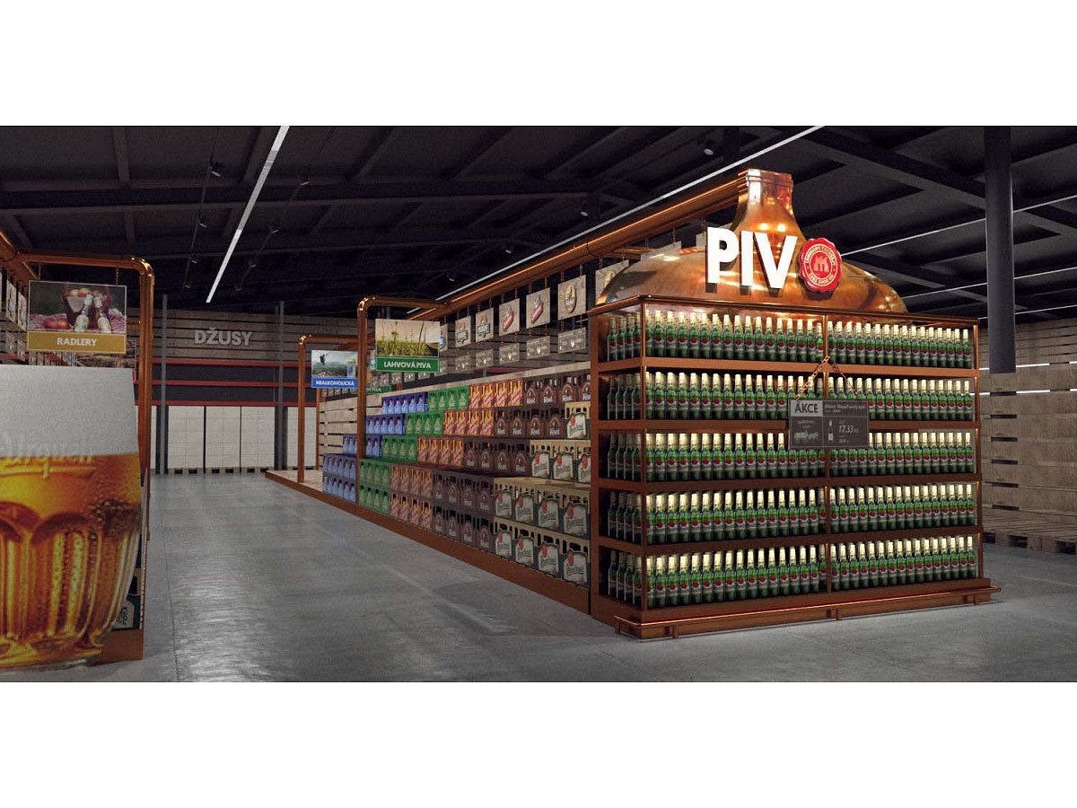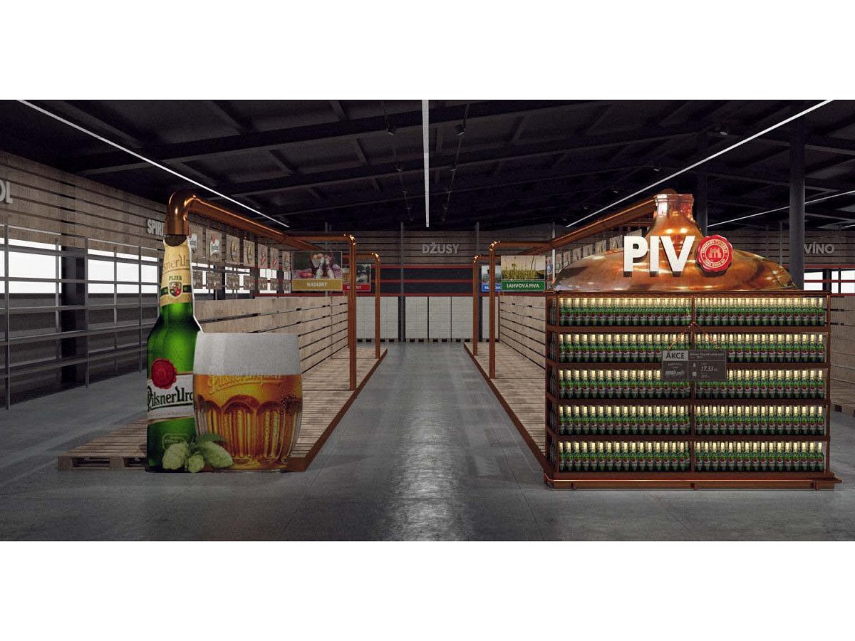 Pro Plzeňský Prazdroj jsme zpracovali návrh na realizaci vystavení produktů v novém konceptu pivní části prodejny.