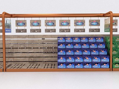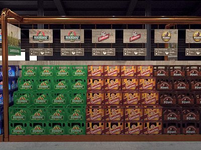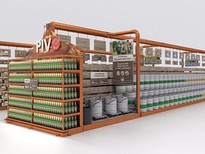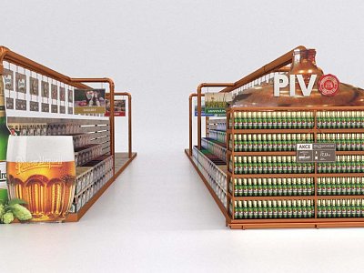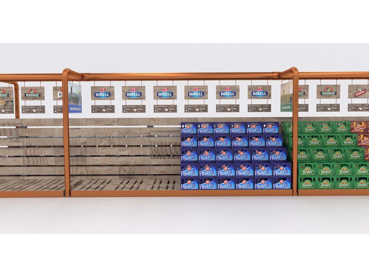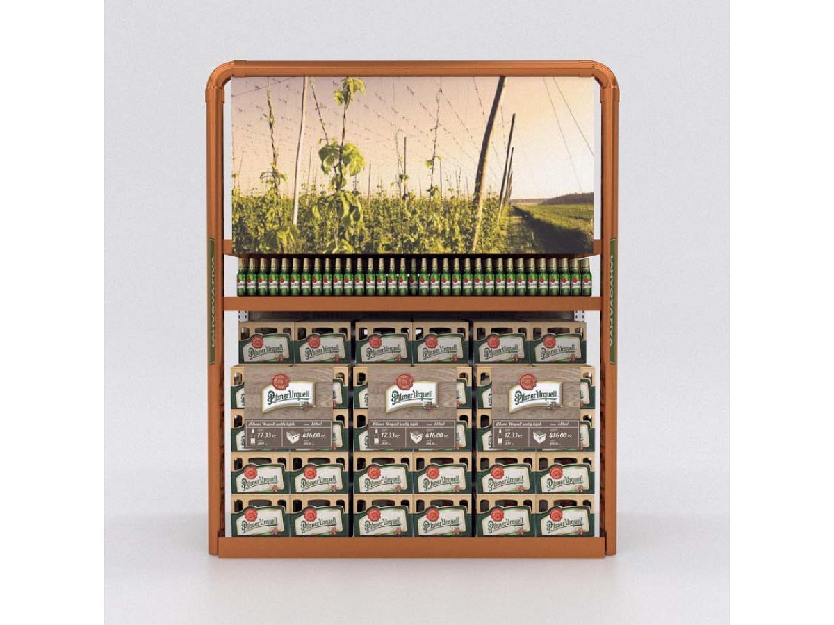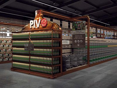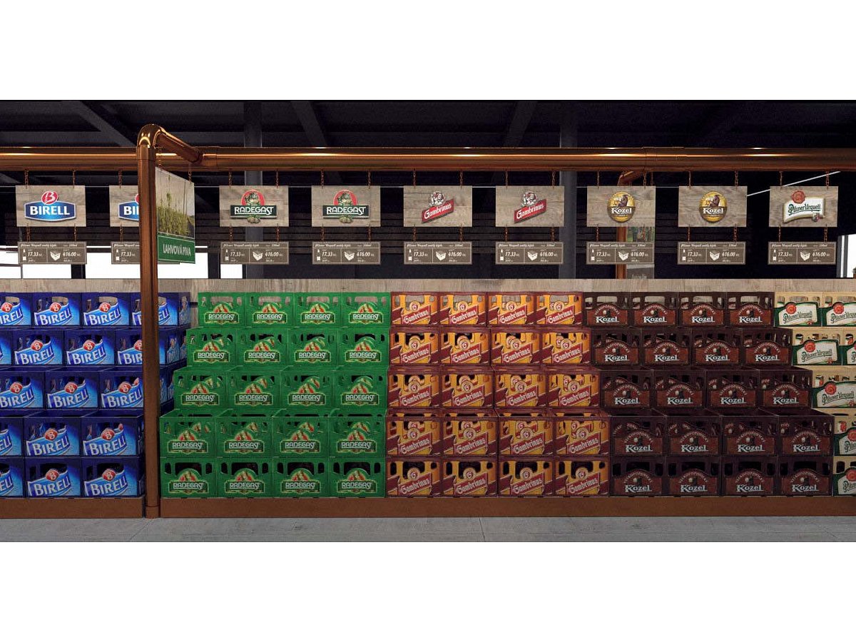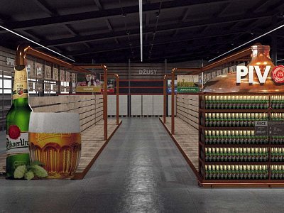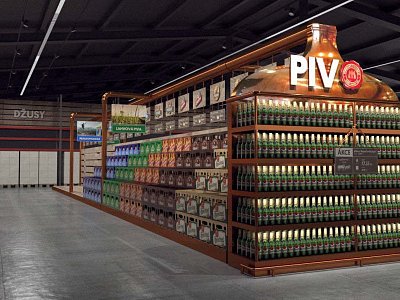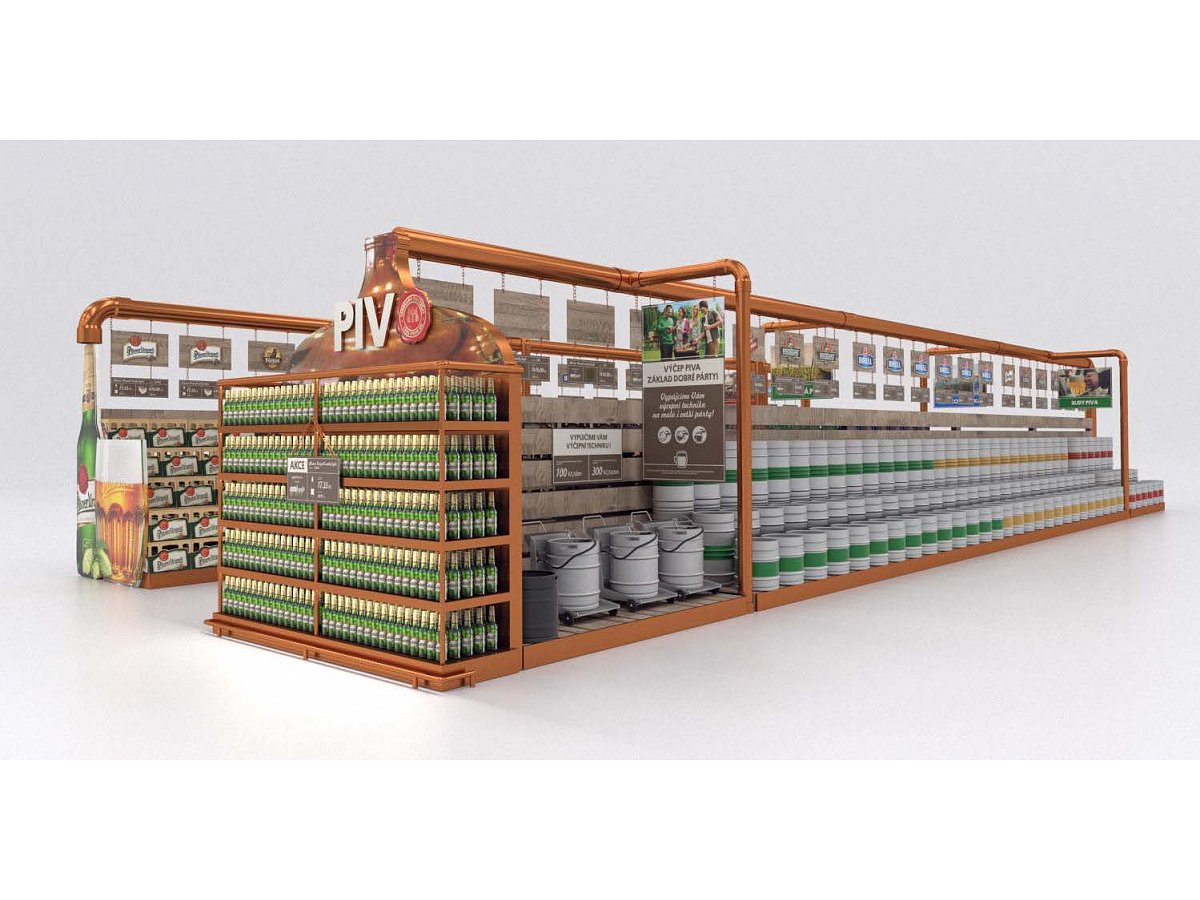 Pro Plzeňský Prazdroj jsme zpracovali návrh na realizaci vystavení produktů v novém konceptu pivní části prodejny.