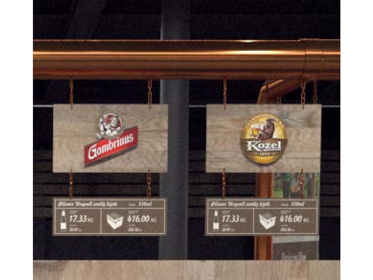 Dominantu pivní sekce tvoří pomyslná velká varna piva na čele hlavní oboustranné uličky piva. Ta "rozváží" pivo dál a odkloněným potrubím ho dělí na jednotlivé kategorie. Jako hlavní a dominantní je navigační označení pivní sekce na čele regálu a to slovem "PIVO". Přičemž písmeno "O" nahrazuje pečeť kvality, logo Plzeňského Prazdroje, který zastřešuje všechny prodávané značky. Čelo druhé uličky tvoří velká grafika na od prezentování momentální novinky nebo promovaného akciového produktu.