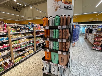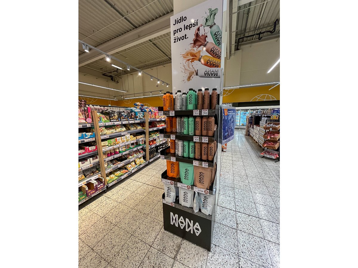 Pro značku potravinových produktů MANA jsme navrhli a vyrobili podlahový stojan určeného do prodejen Globus.