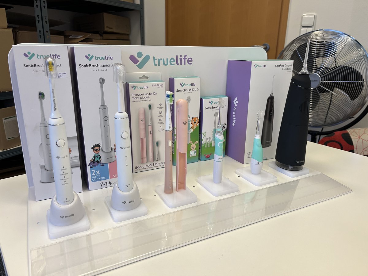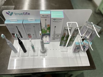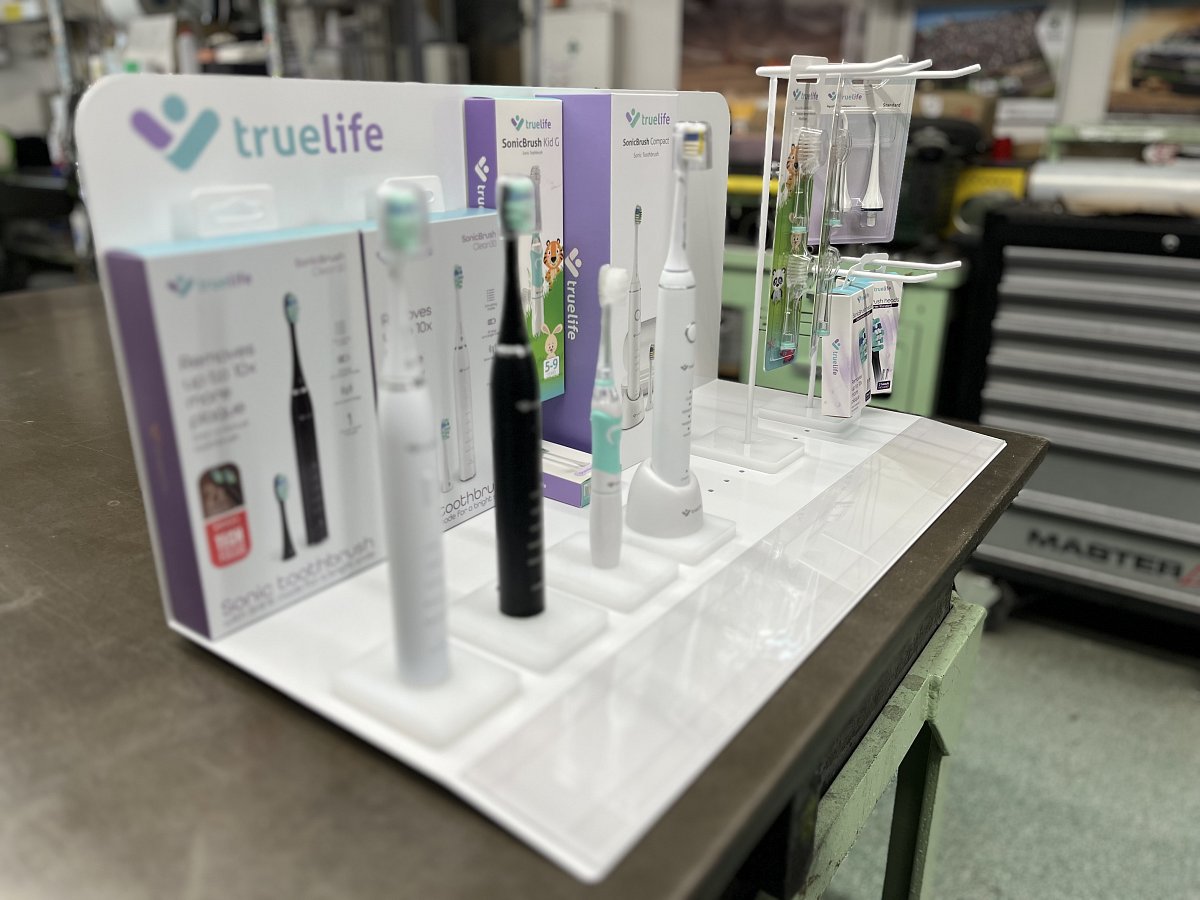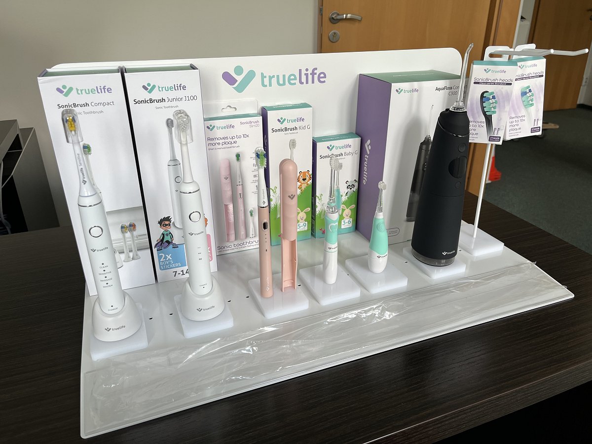 Displej určený k prezentaci sonických zubních kartáčků Truelife a dalších produktů dentální hygieny v prodejnách Teta drogerie.